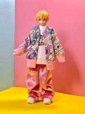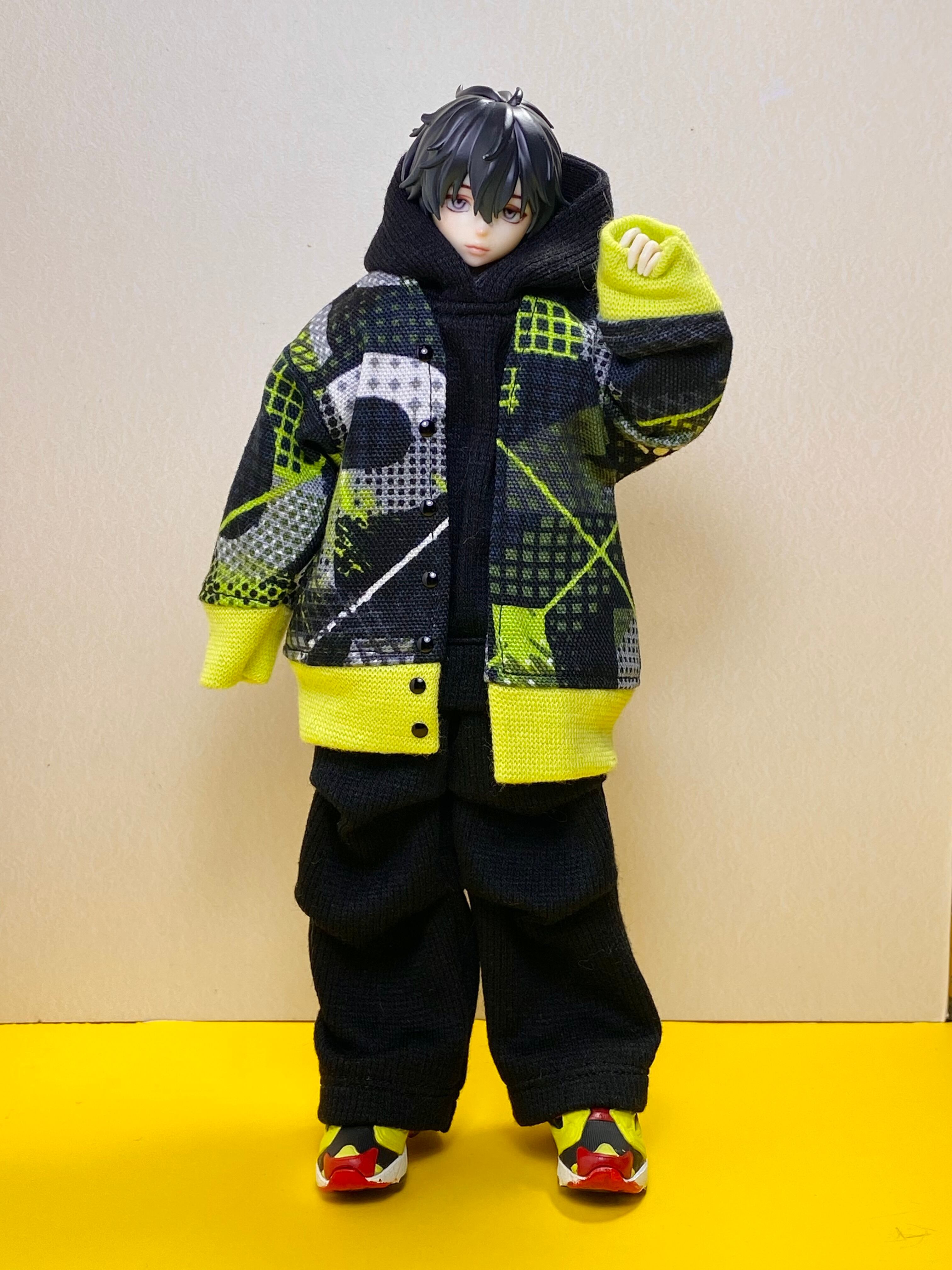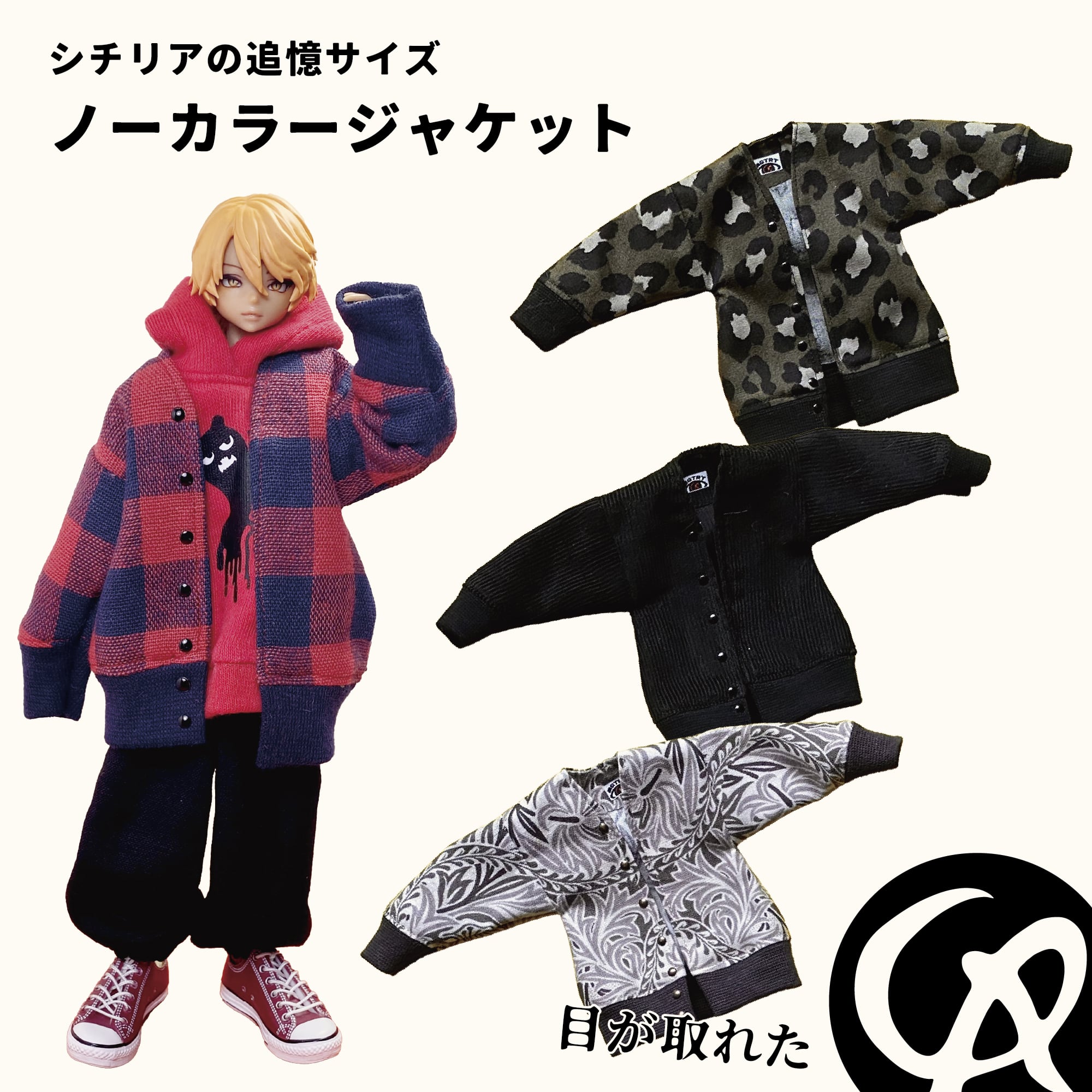 ・後ろに開きがないトップスは、ヘッドパーツを取り外して着脱させてください。また、袖口やパンツの裾を絞ってあるものは、着用しづらい場合は無理に手足をねじ込まず、ハンドパーツ、足パーツを取り外すなどして着脱願います。手芸用鉗子やピンセットを使用していただくと着せやすいです。