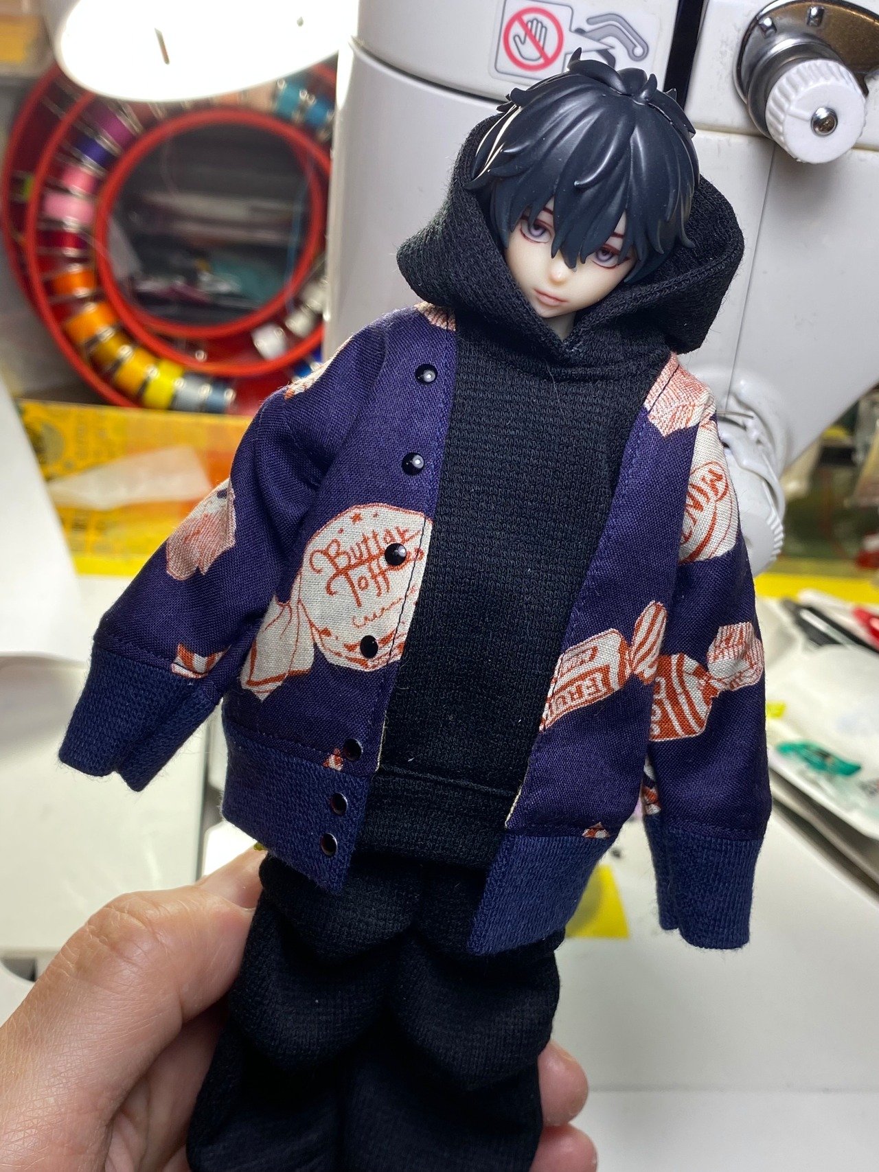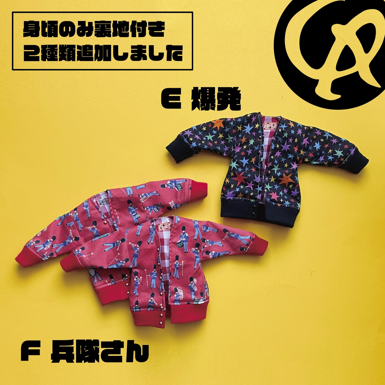 D:身頃のみ裏地付きです。薄手素材なので裏地付きでも柔らかくポーズがつけやすいです。ネイビー地にオフホワイトとオレンジの飴ちゃん柄、裏地は色違いの布です(イエローベージュ)。