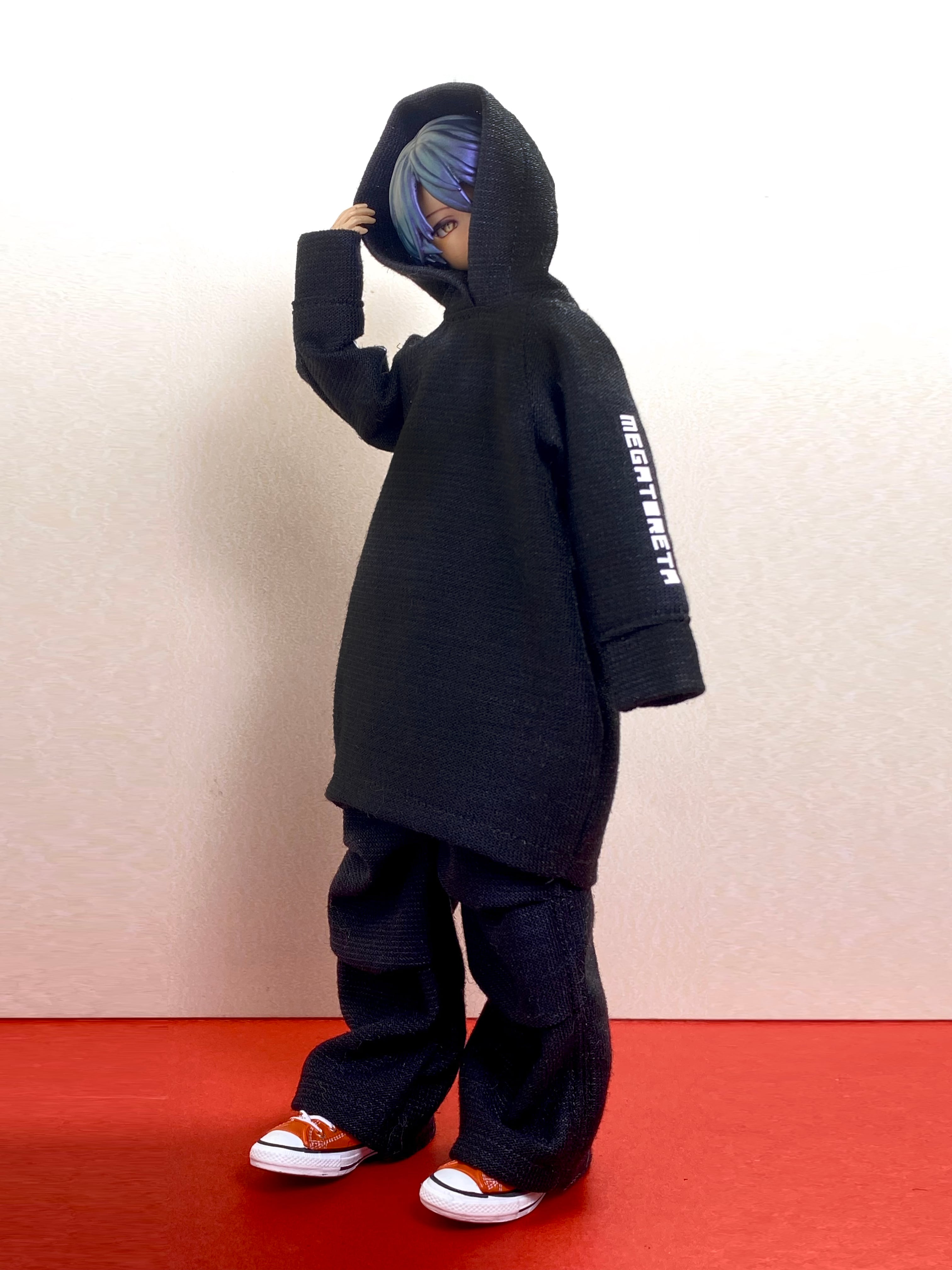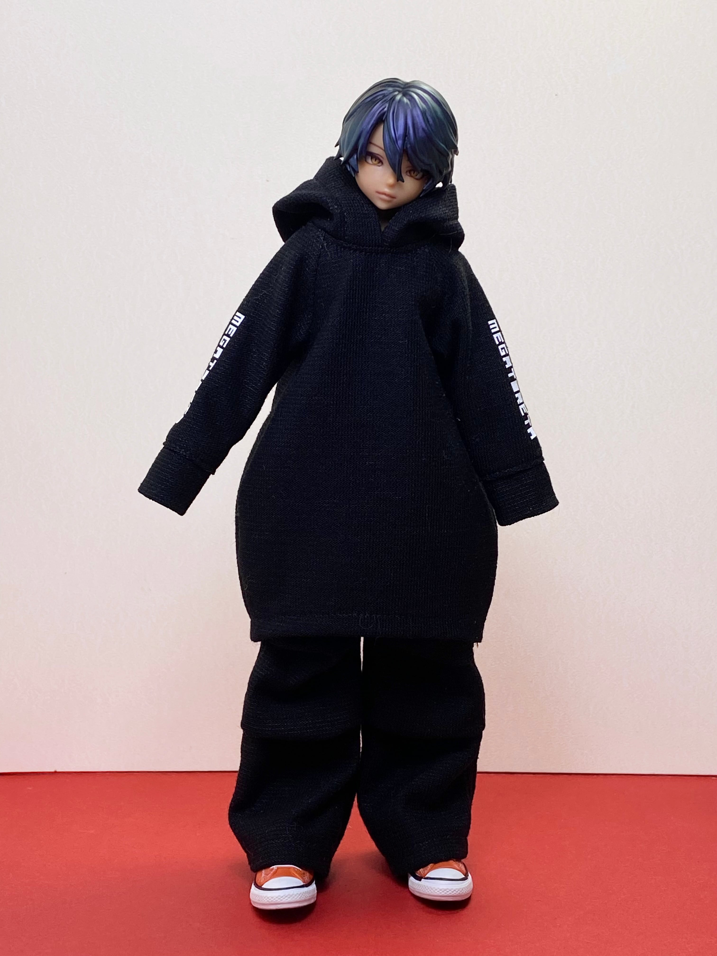 ・後ろに開きがないトップスは、ヘッドパーツを取り外して着脱させてください。また、袖口やパンツの裾を絞ってあるものは、着用しづらい場合は無理に手足をねじ込まず、ハンドパーツ、足パーツを取り外すなどして着脱願います。手芸用鉗子やピンセットを使用していただくと着せやすいです。
