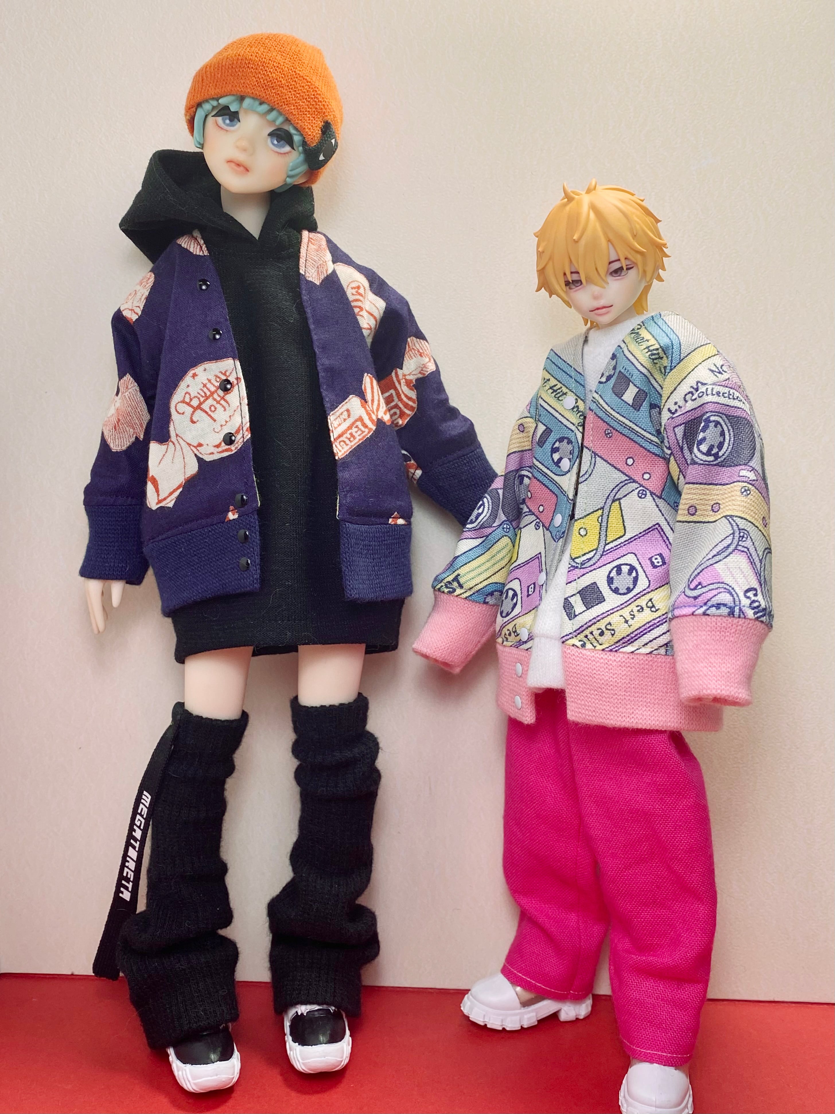 写真3枚目はアウターと合わせた着用イメージ、4枚目では22センチのピュアニーモSボディ(左の子)にフーディーをワンピとして着せています。